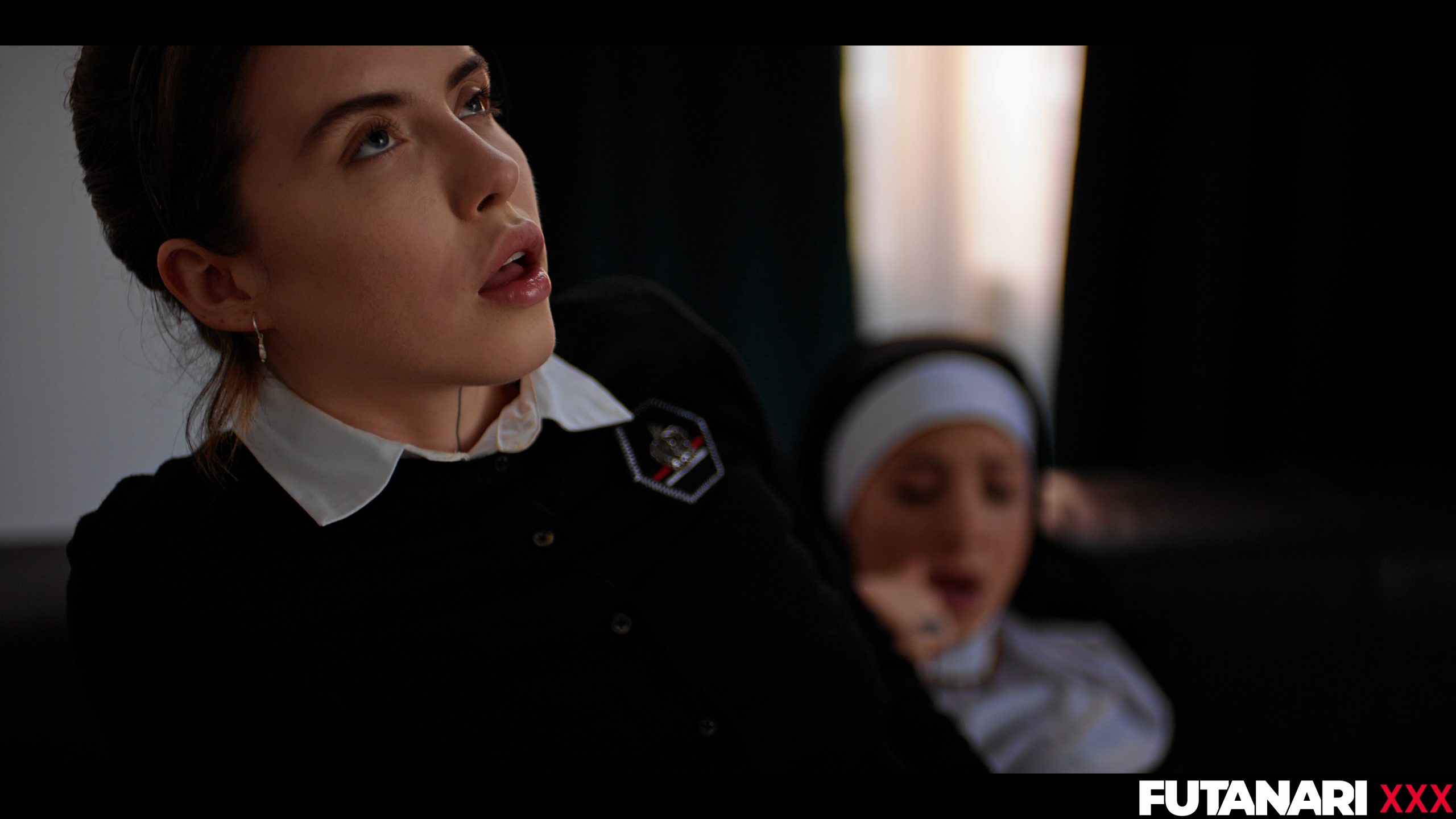 Now Eden takes off her panties and starts riding her teacher’s hard futa cock, with so much passion that Nathaly never experienced before. She tries to hold herself back, but the pleasure is too much and she gives Eden a huge creampie. Finally, Eden takes Sister Nathaly’s cock and puts it in her ass, finishing with an intense anal pounding.