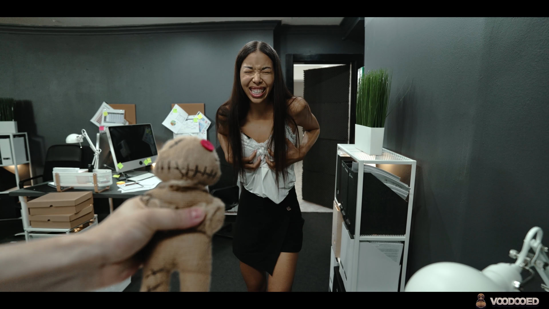 Sam is fed up when his boss, Lia Lin, dumps a mountain of work on him, threatening to fire him if it's not done. Finding a voodoo doll on his desk, Sam uses it to control Lia, making her strip and pleasure herself in front of him. Lia, now under his control, moans as she reaches orgasm, while Sam quits his job, leaving her humiliated.