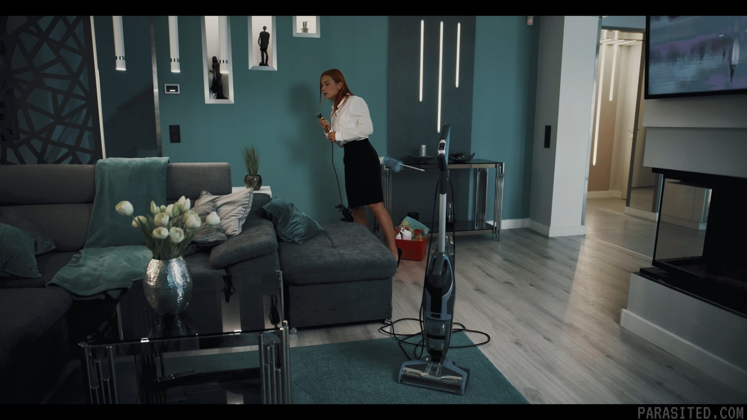 Clemence enters the living room carrying some cleaning supplies. She is new Amirah's cleaning lady.