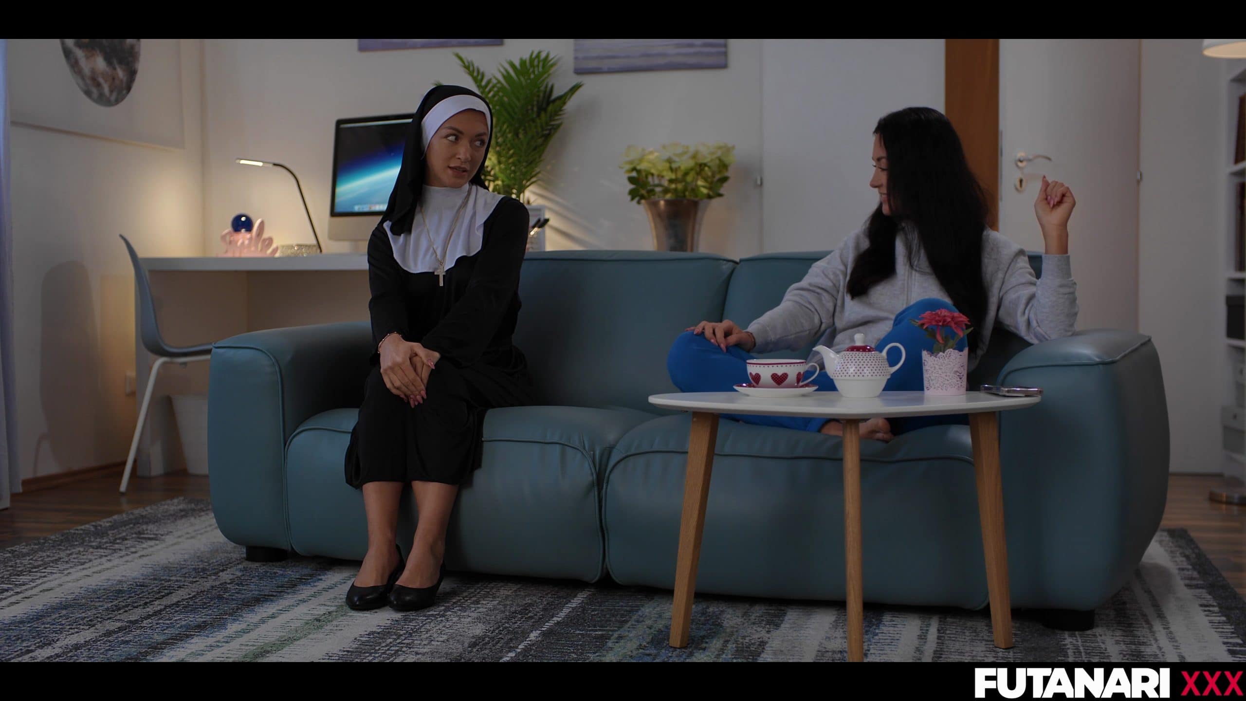 It’s done on purpose, the nun wants to stick it to the devil and one-up her, she wants to be better but what does Zuzu think? She can’t decide yet, they were both good and this whole Futanari thing is new to her. No problem though, the nun has an ace up her sleeve, and she’s willing to go a step further. She bends over and lifts up her habit, revealing a firm ass and black panties that promptly get pulled down. She mounts on top of Zuzu’s cock that’s still hard and ready for more.