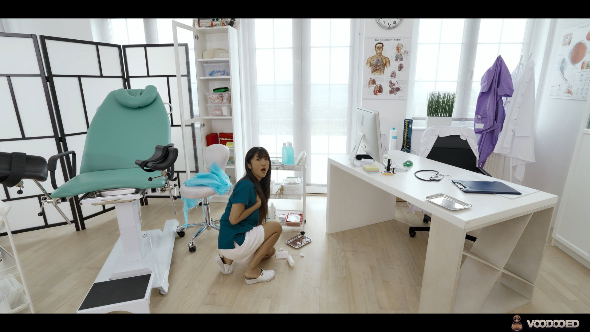 In the doctor’s office, Sam Bourne notices a sexy nurse Emiri Momota bent over as she organizes equipment. He takes a seat and picks up a voodoo doll nearby, showing it to her. With a confused look, she resumes her tasks, but Sam begins experimenting with the doll’s arm.