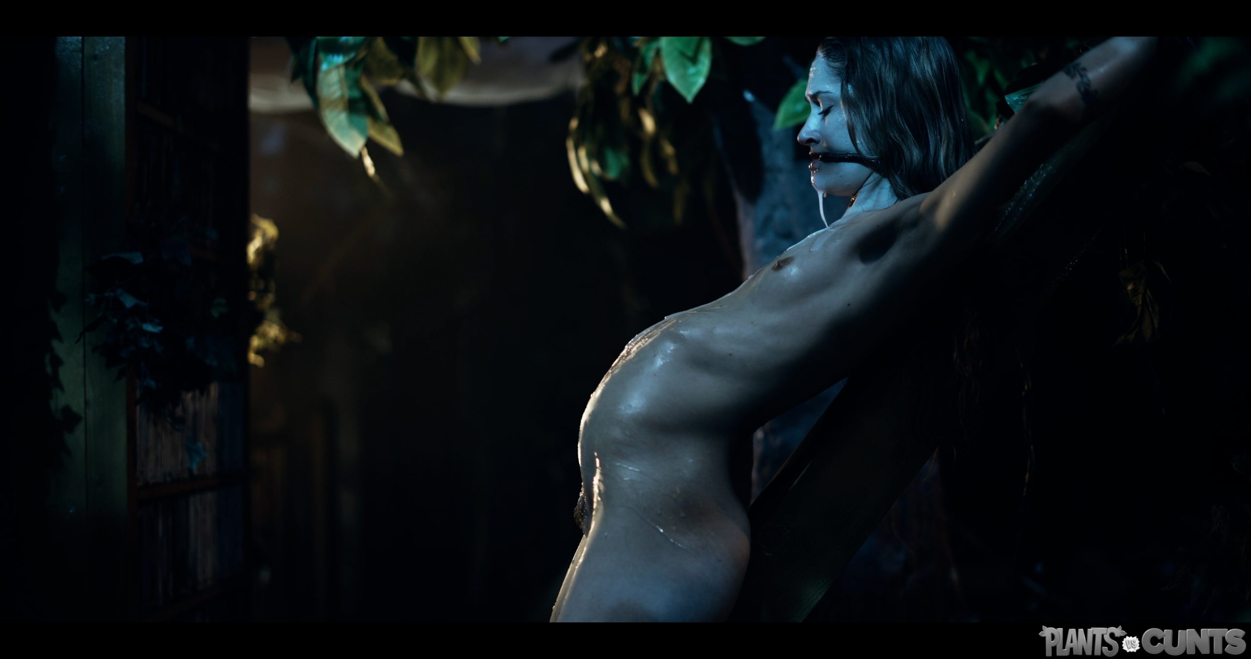 What a lot of action packed into a 10 min scene! She is caught, stripped by the vines, pounded and triangle pussy patch, Then anal play begins with 2 going ATWT, an open scene cum blast the covers her body & face! Tiffany than gets tied x crossed losses her top and the cum keeps flowing!! Bravo Tiff for taking extreme elements in a short video,m a Keeper for me!!!