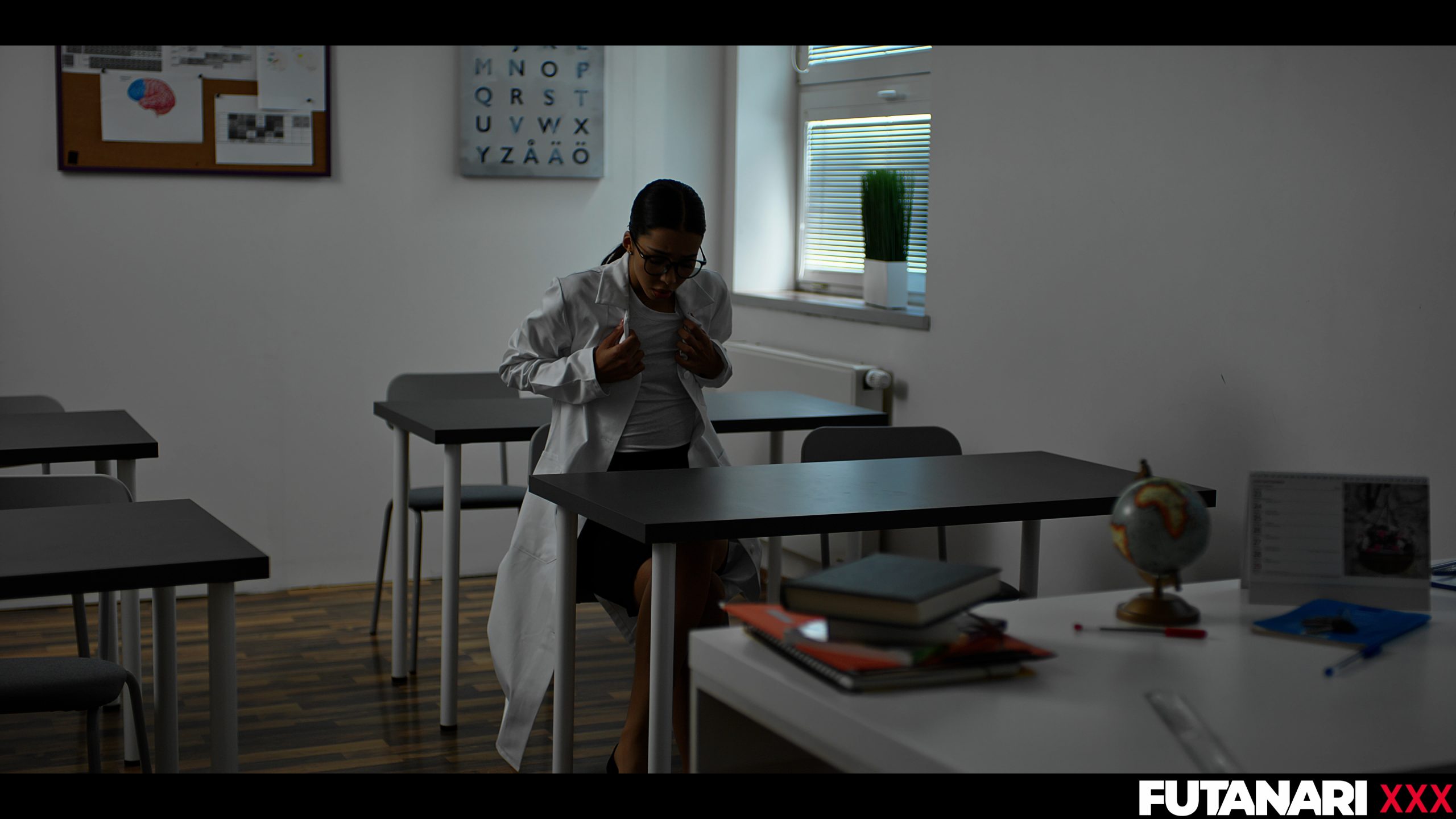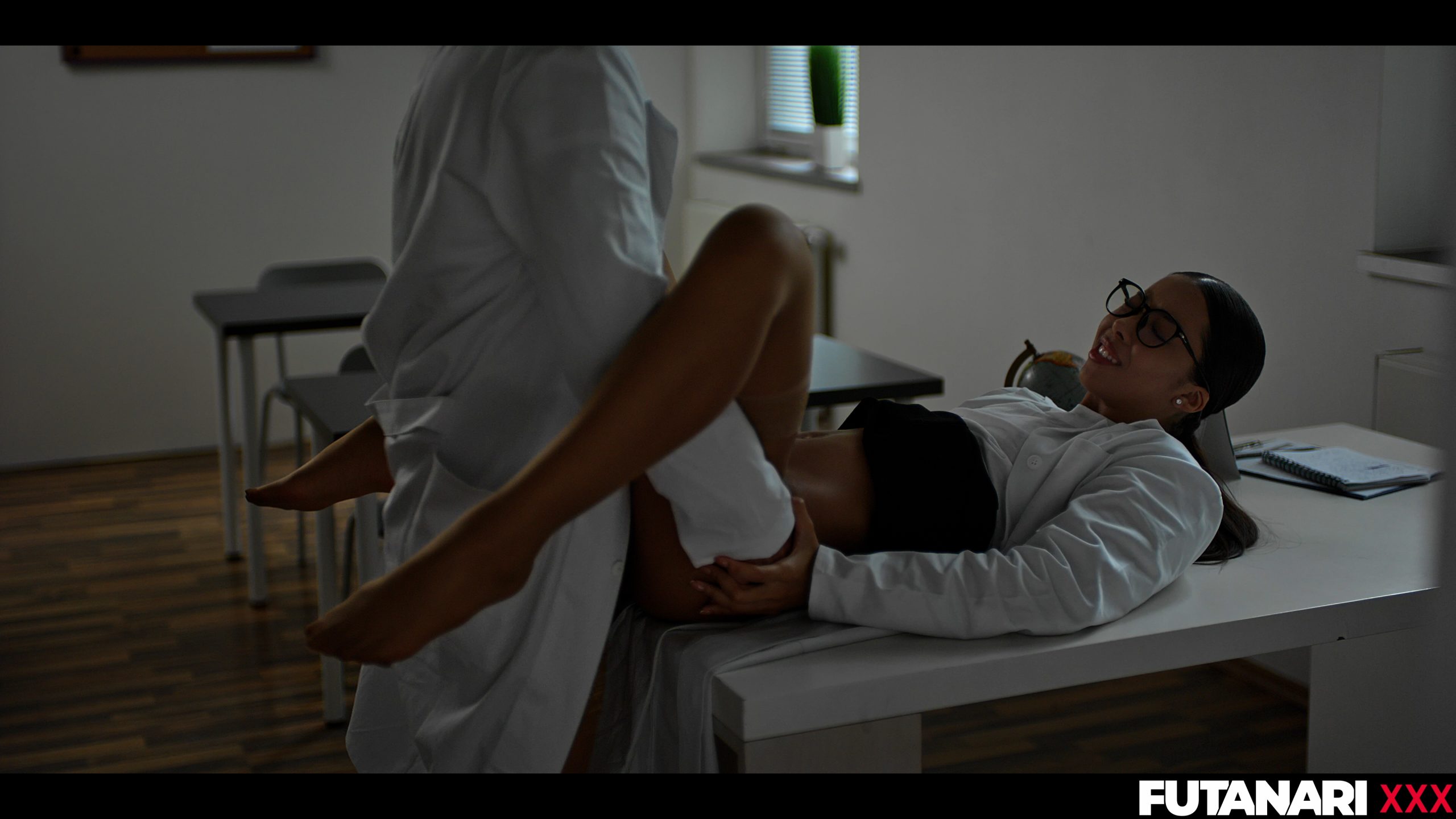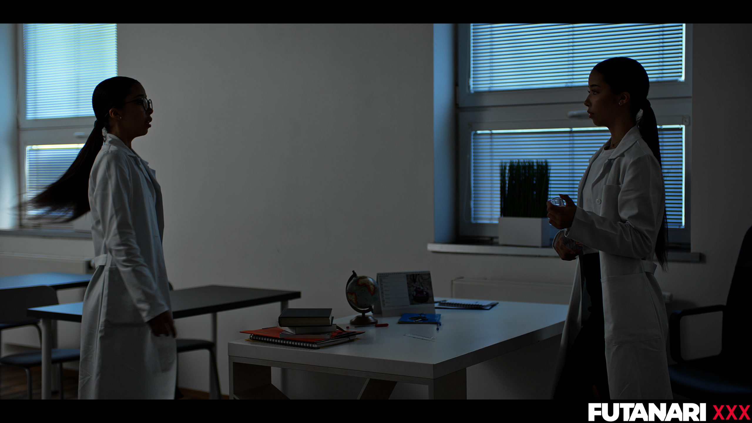As she is talking, she slides her hand into Lia’s pants and starts exploring her. Lia is resisting, but pleasure starts taking over her body. Now, SCP-8200 begins her re-education by teaching Lia the first lesson: “Pleasure is everything.” She pushes Lia onto the desk and pulls out her huge futa cock, driving it deep inside Lia from behind. Lia is slowly letting pleasure take over her body and mind, and now it’s time for the second lesson: “Resistance is futile.”