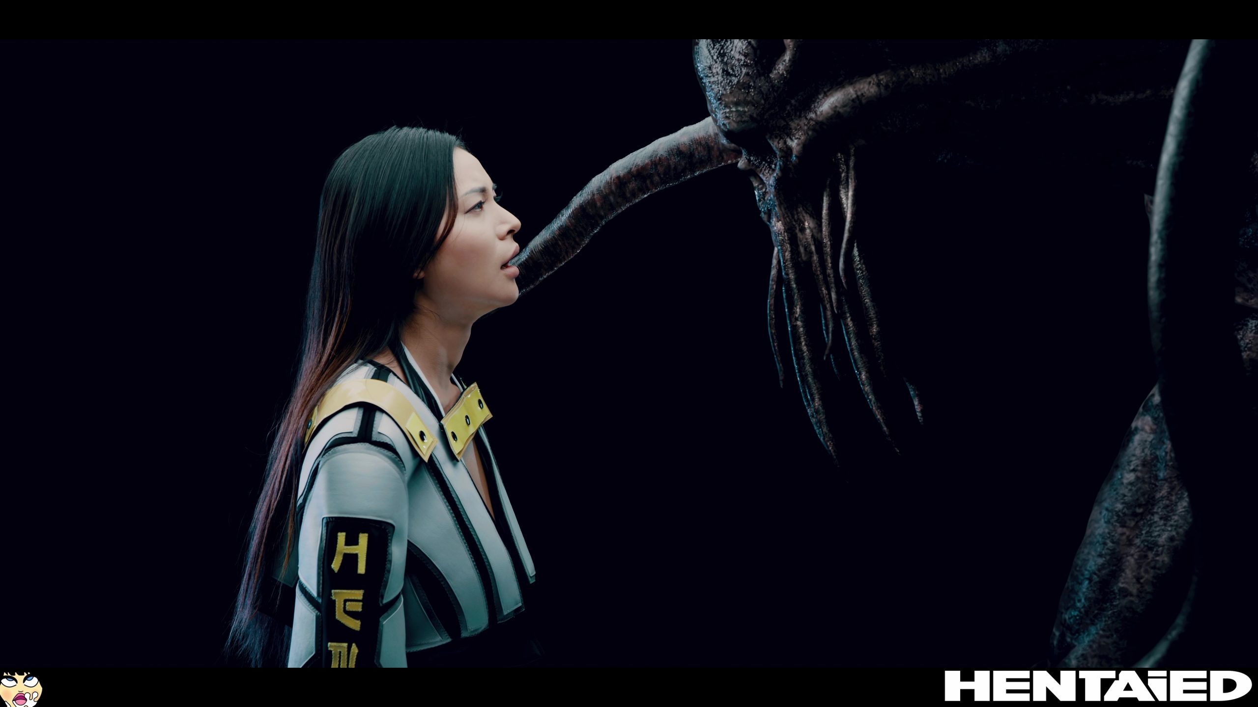 She’s standing still, wearing a special outfit that leaves most of her body exposed. Facing an alien monster, Rae doesn’t know what to expect. Instantly, one of the scary tentacles wraps around her neck. A couple get under her clothes and tear them off her body.