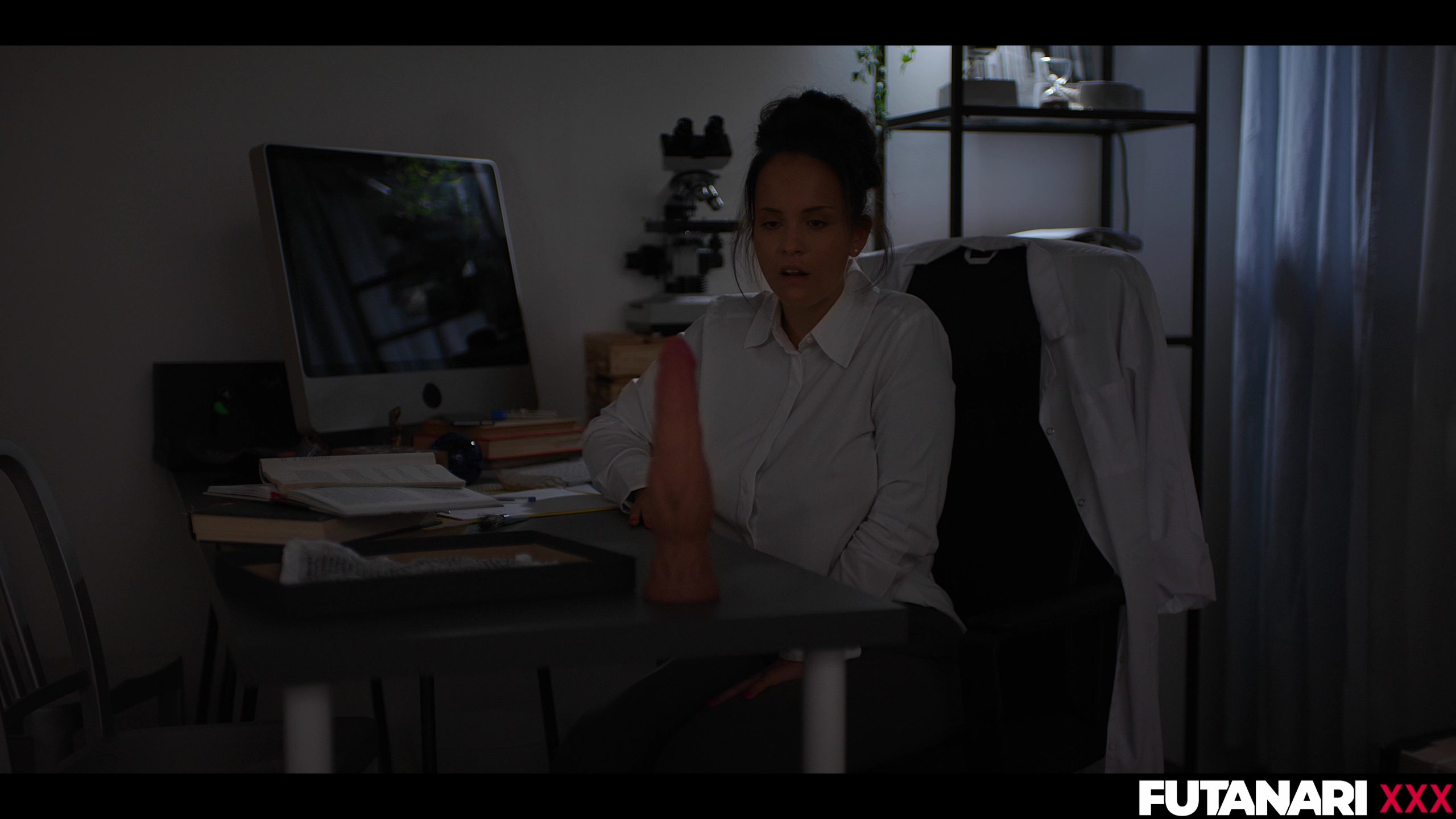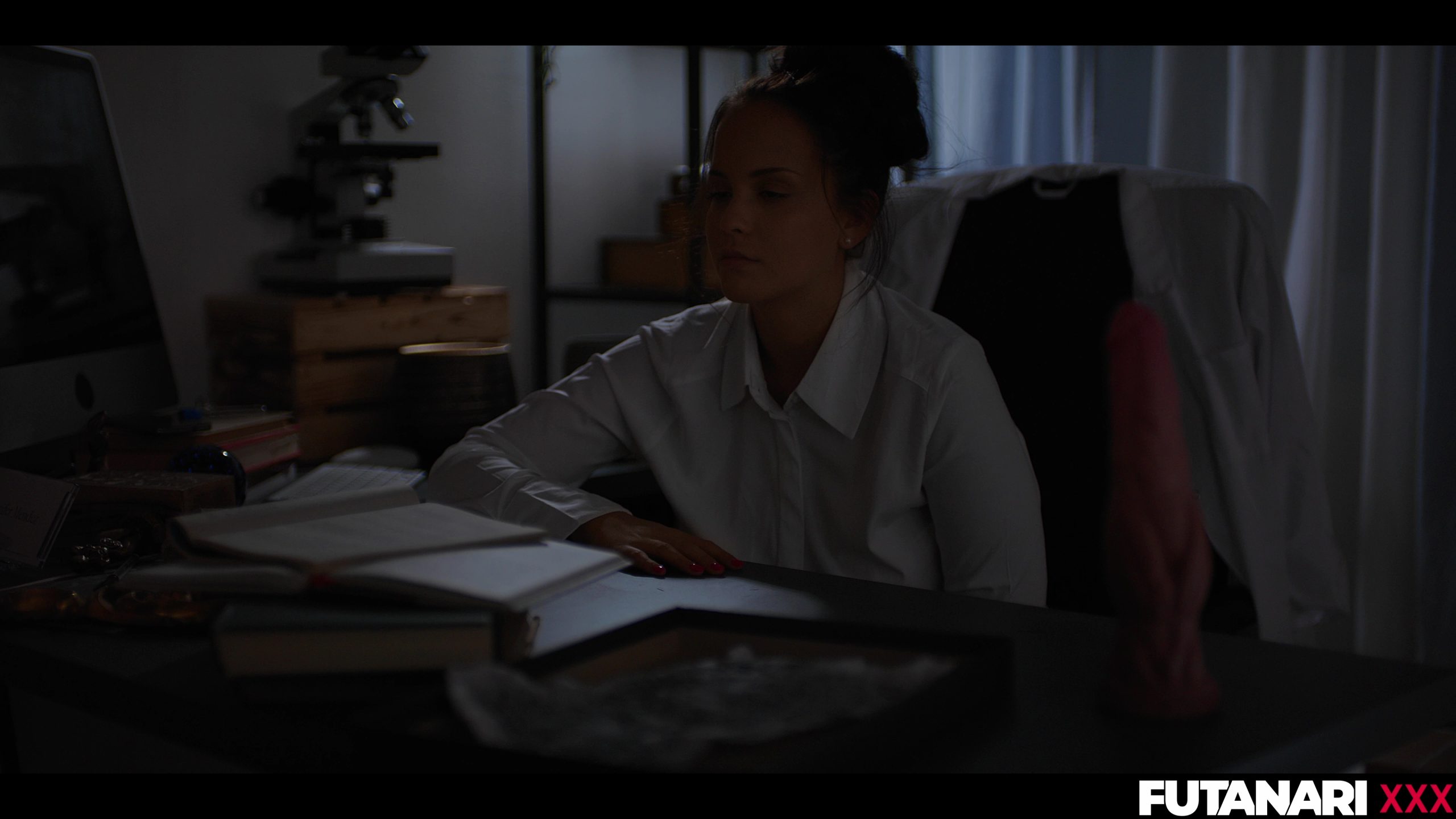 Jennifer quickly collects her thoughts and gets back to much more important work. She starts deciphering old scriptures about the artifact, researching more about it, so much that she falls asleep right at her desk. It’s already night, and she’s waking up. As soon as she opens her eyes and sees the cock-shaped artifact, Jennifer’s whole body starts to heat up. Her breaths get deeper, she grabs the artifact and starts licking it.